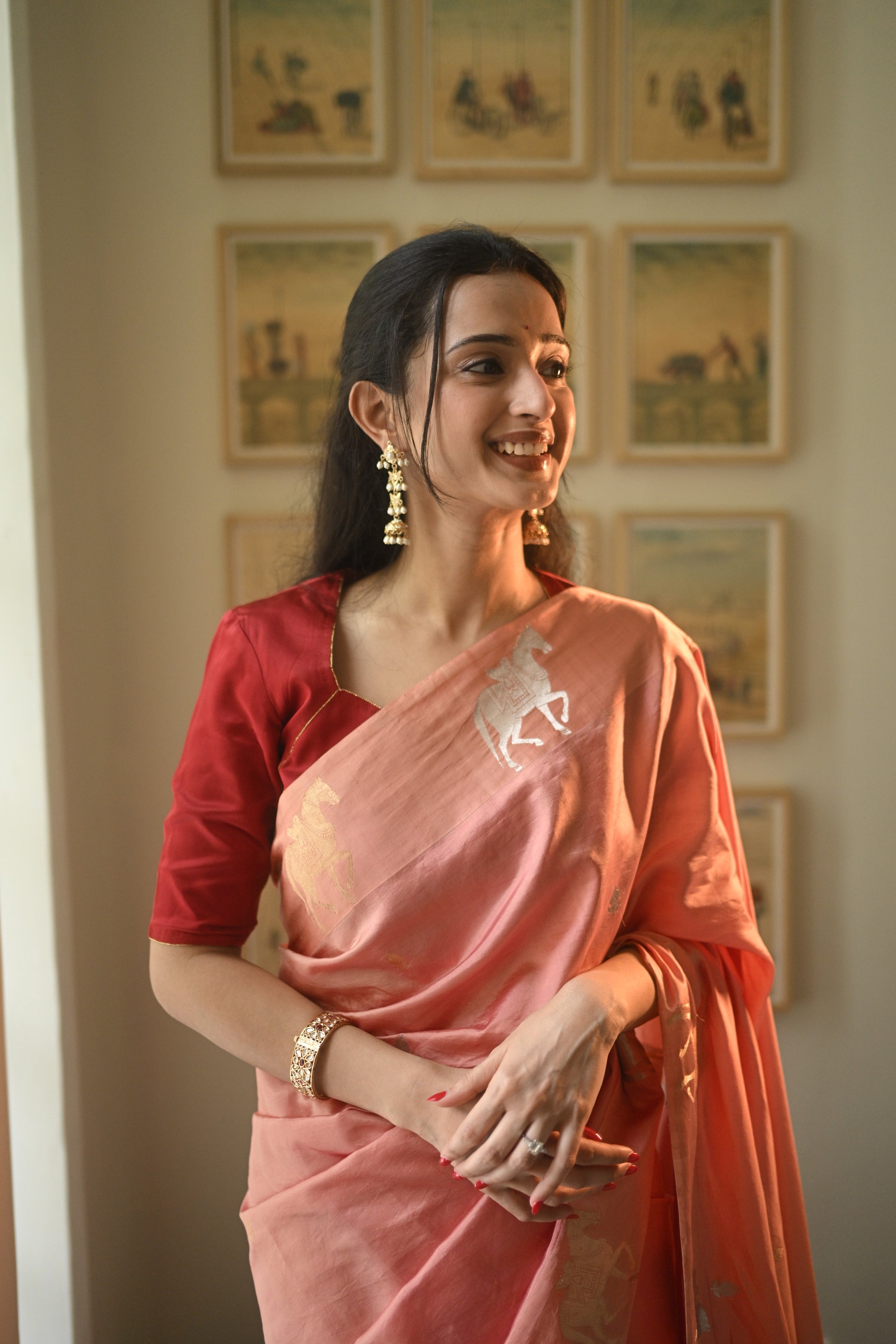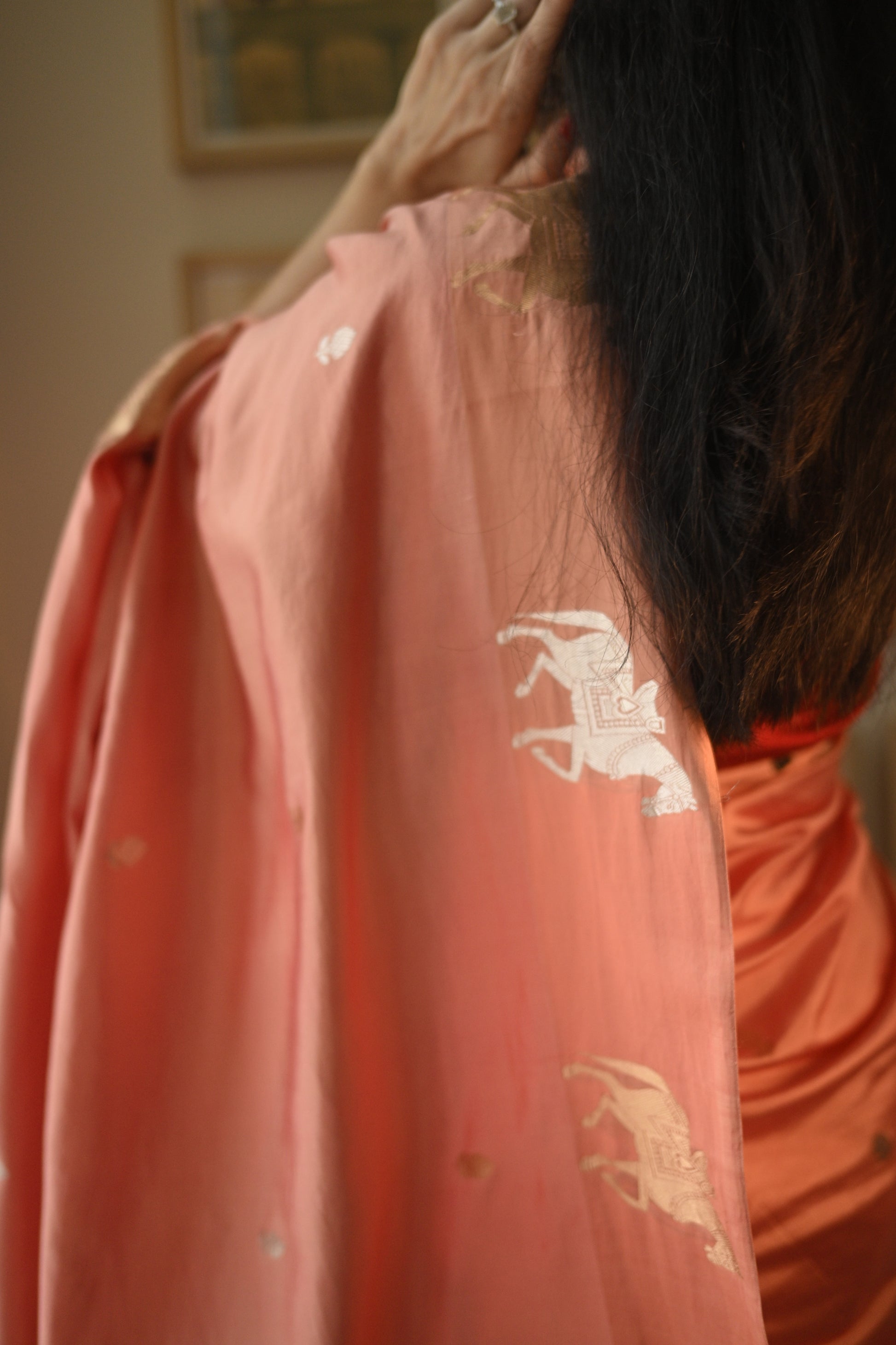 A refined creation in lustrous Katan silk, this Banarasi saree shines in a delicate blush pink hue. The drape features intricately woven horse motifs in gold and silver zari, adding a distinctive touch to its elegant body. A lustrous satin finish border enhances the design, balancing tradition with modern polish.
