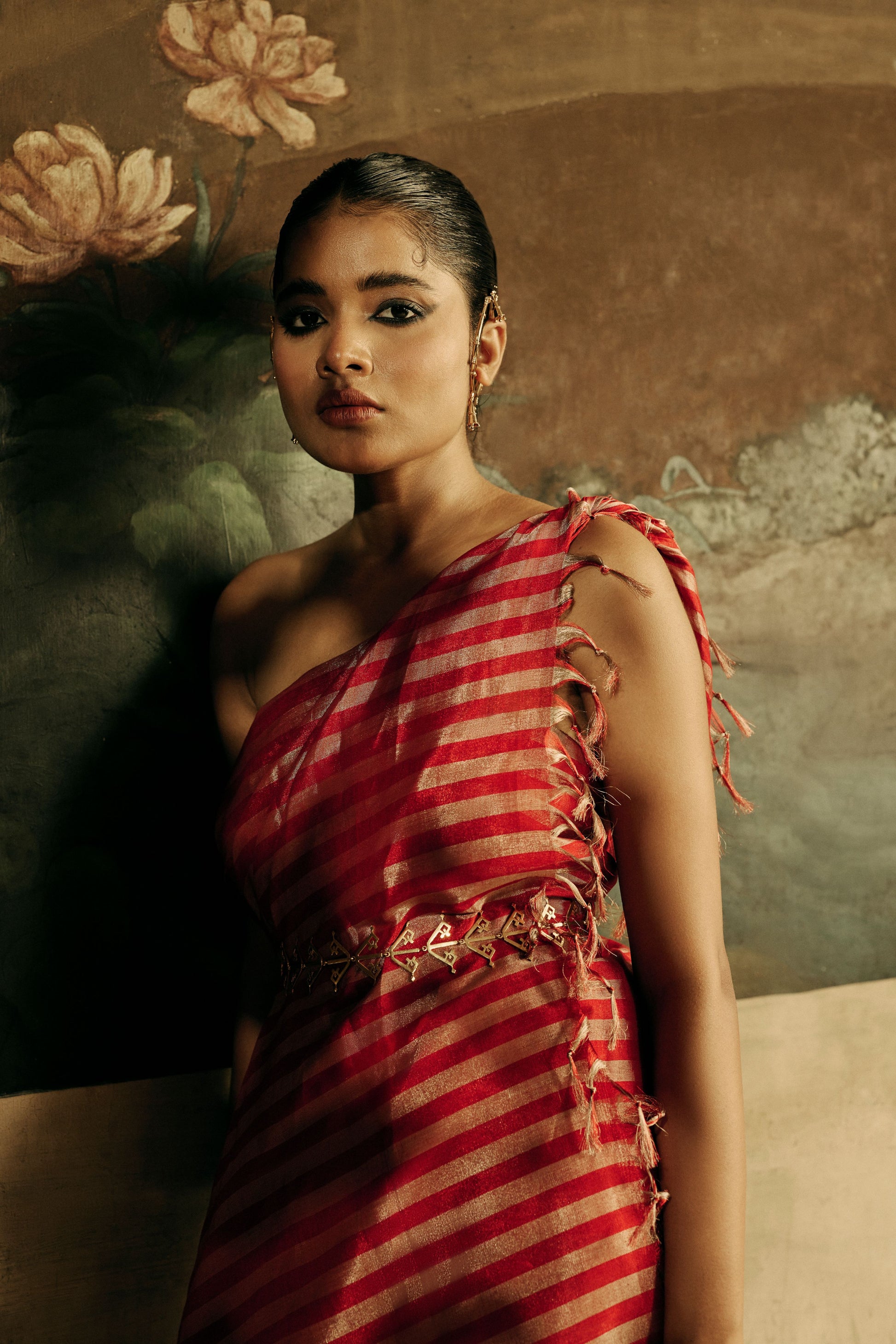 A luminous ode to simplicity and grace, this handwoven Chanderi silk saree brings alive the timeless pairing of red and gold. The body glows in vibrant red, accentuated by fine golden horizontal stripes that shimmer with the understated elegance Chanderi is known for.
