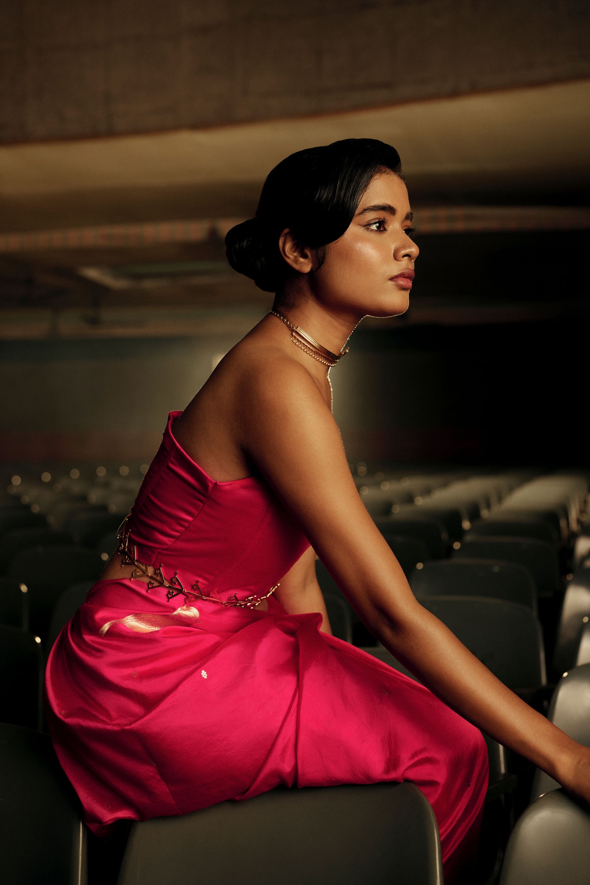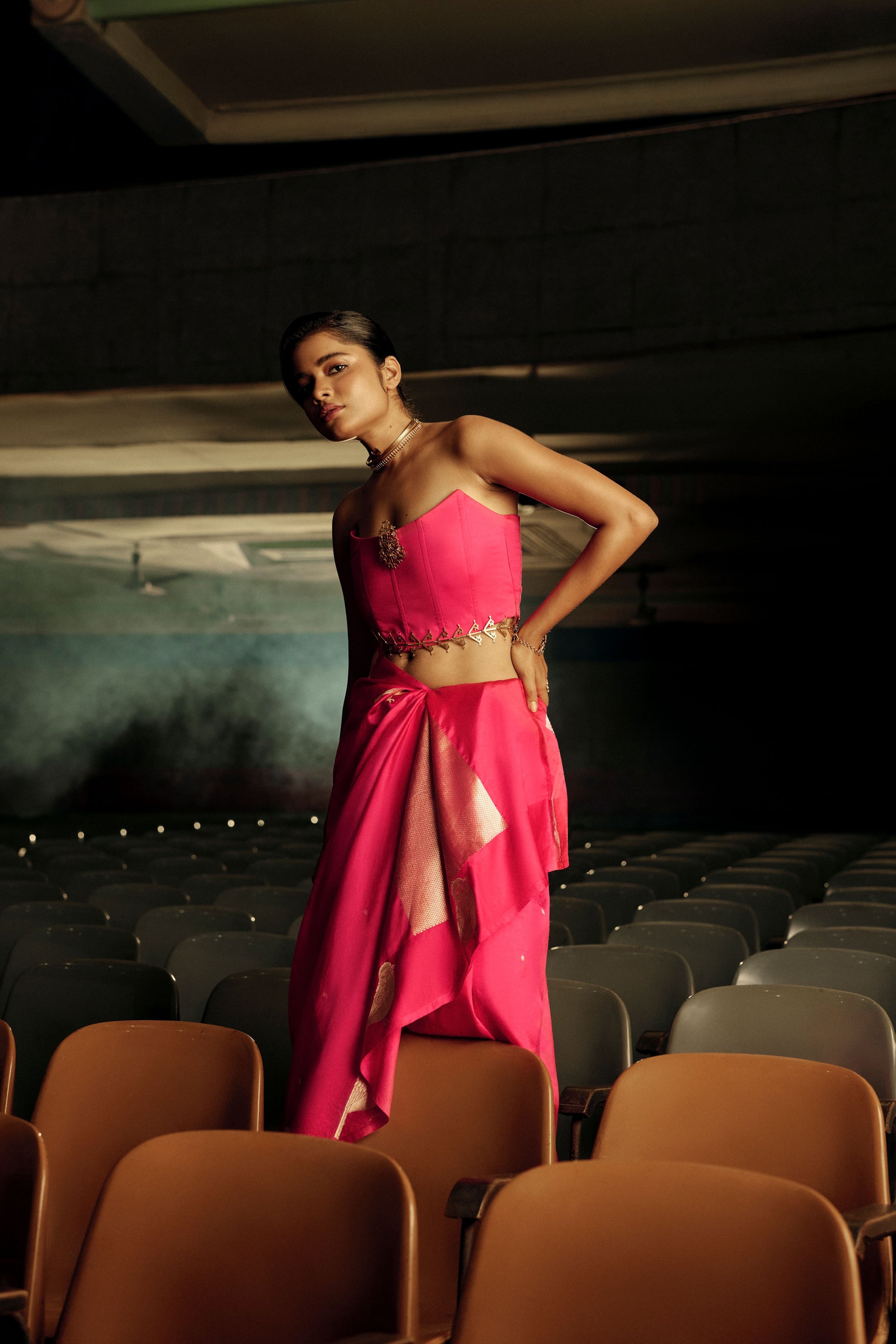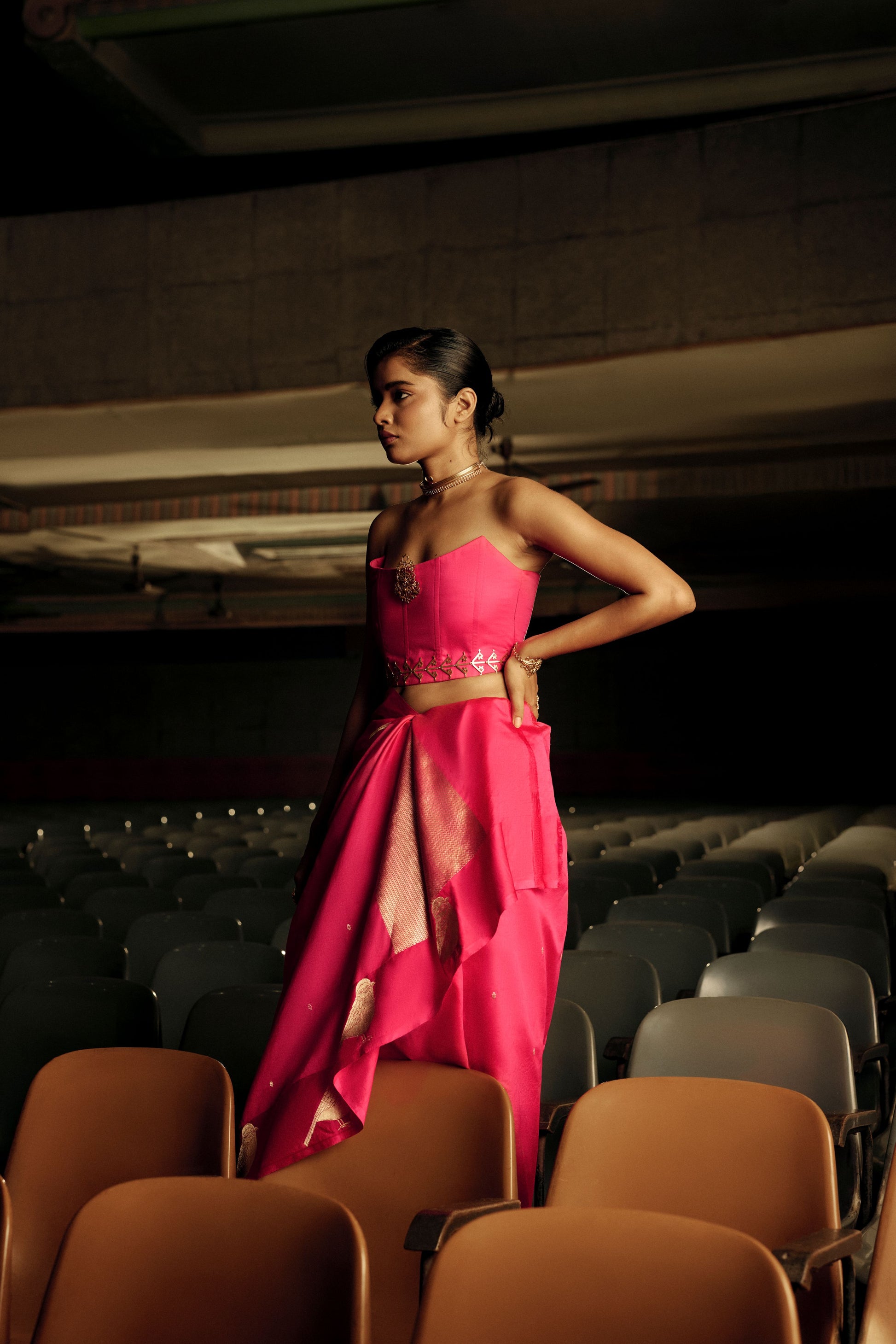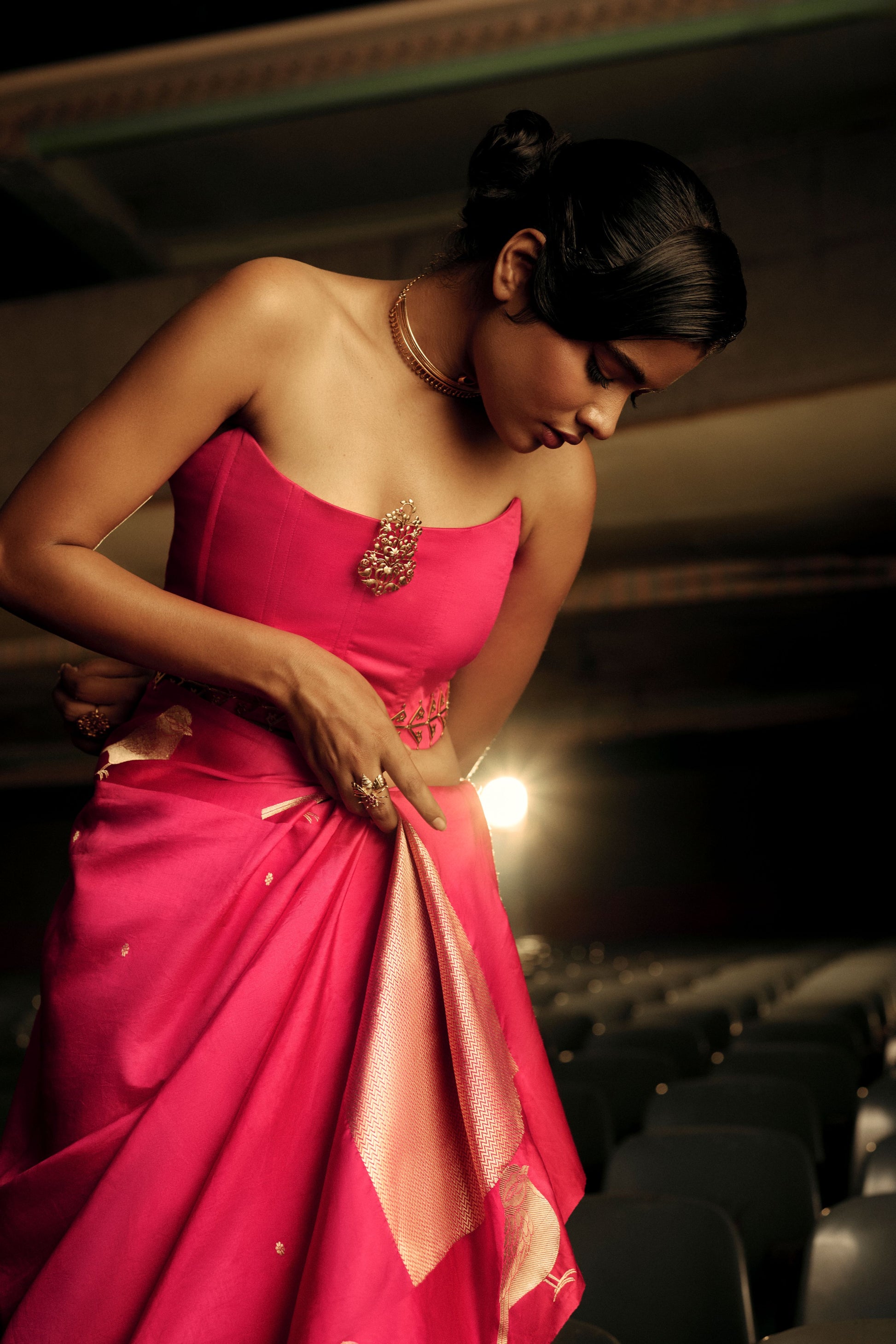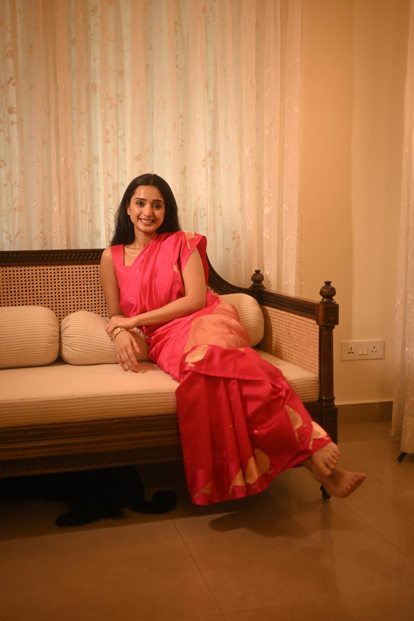 A vibrant celebration of traditions and modernity, this Banarasi silk saree shines in a striking fuchsia hue. The drape is adorned with intricately woven bird motifs, symbolic of freedom and grace, crafted in zari that glimmers against the rich silk body.